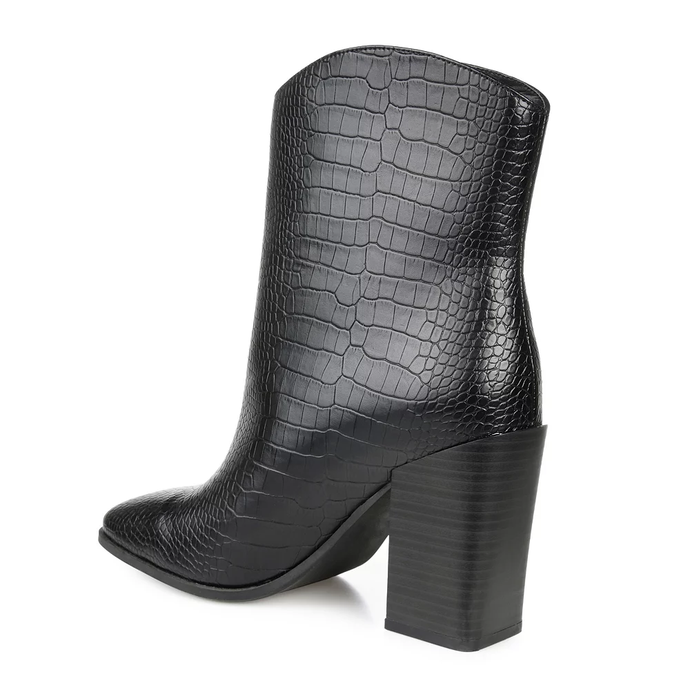 Strut your stuff in these Journee Collection Brekinn Tru Comfort Foam heeled booties with a western style silhouette and crocodile texture.